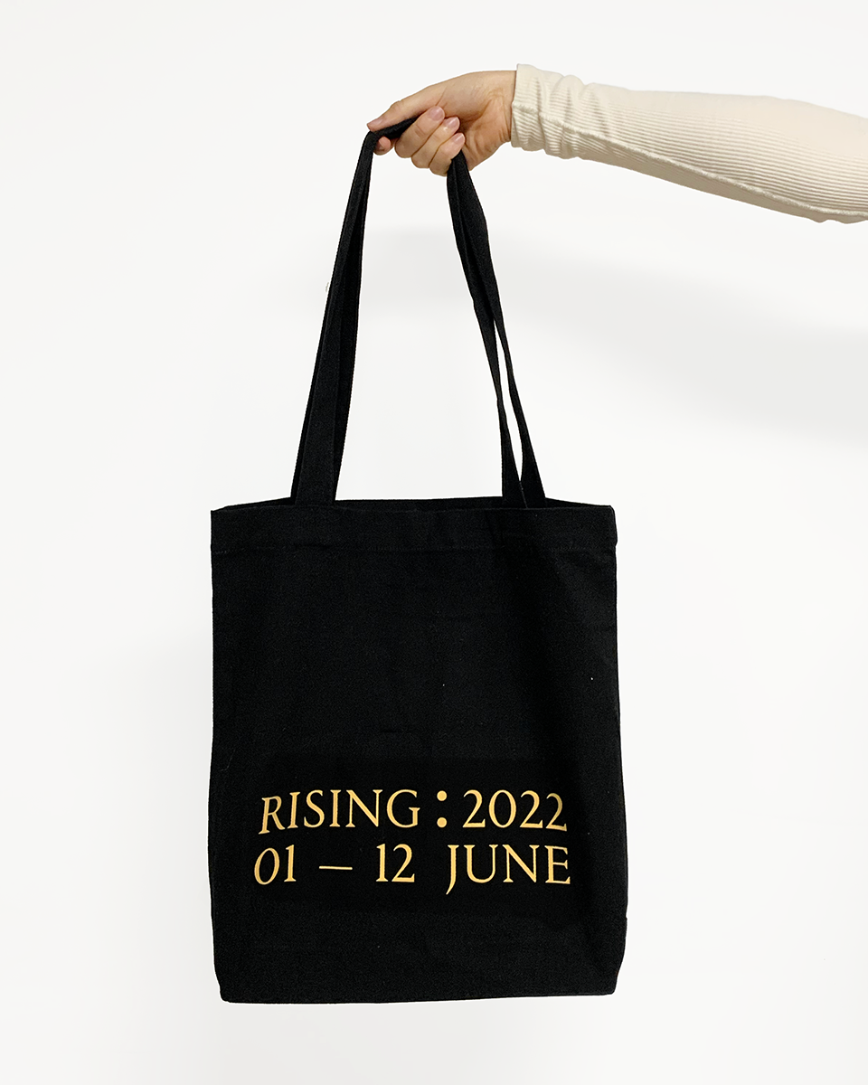 Nab an official RISING 2022 tote bag. The painterly moon design resembles a storm cell representing the turbulence of the past few years.